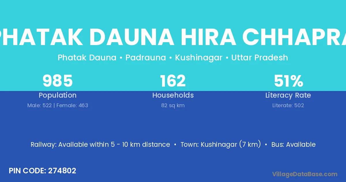 Kushinagar (7 km) is the nearest town to Phatak Dauna Hira Chhapra village for major economic activities and is located approximately 7 km away.