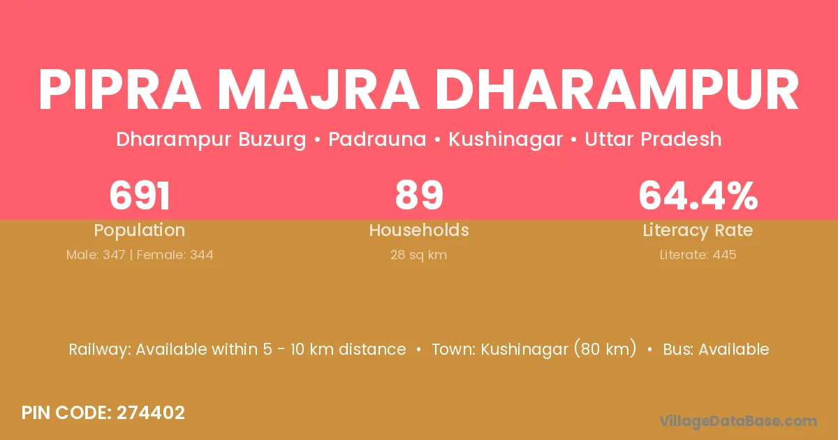 Kushinagar (80 km) is the nearest town to Pipra Majra Dharampur village for major economic activities and is located approximately 80 km away.