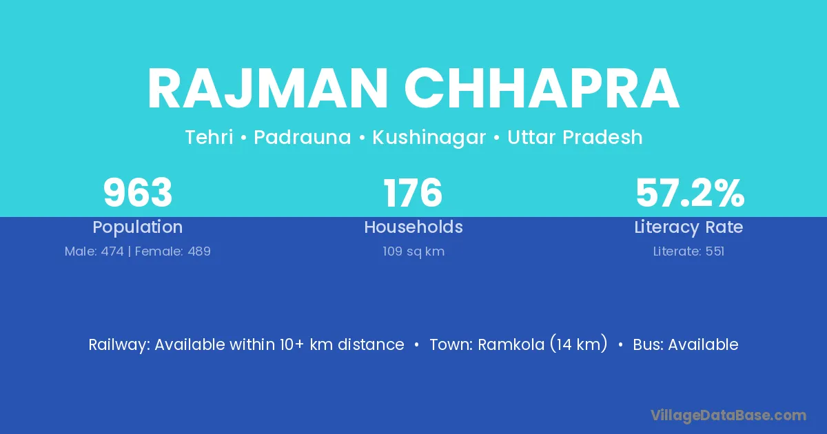 Rajman Chhapra village has a total population of 963 people, of which 474 are males and 489 are females.