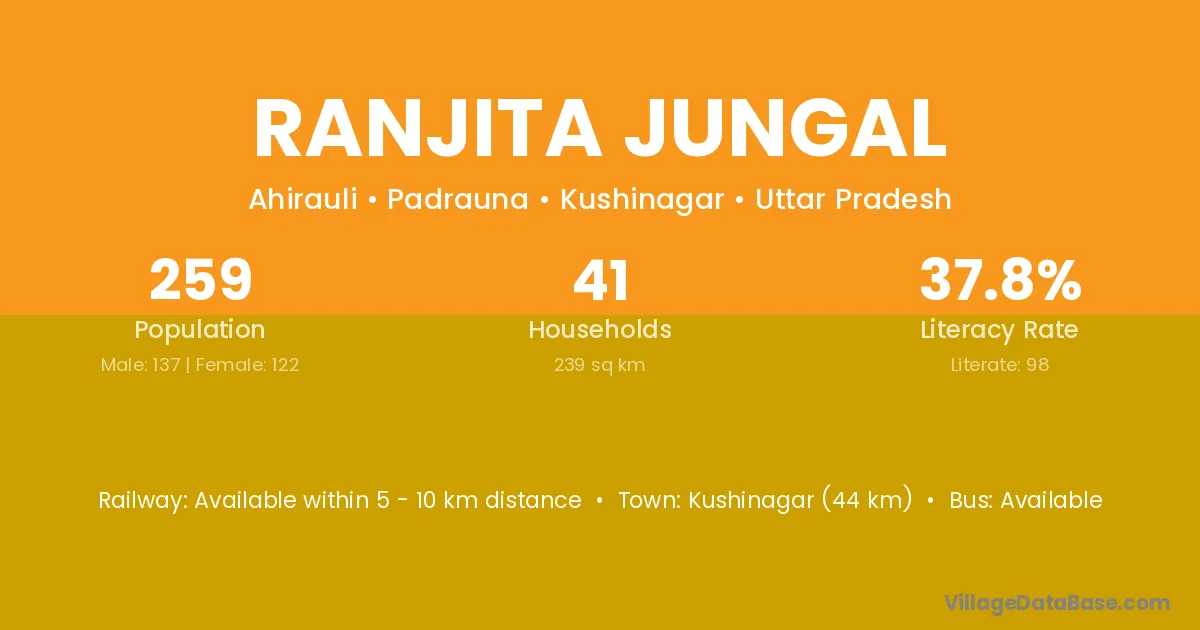 Kushinagar (44 km) is the nearest town to Ranjita Jungal village for major economic activities and is located approximately 44 km away.