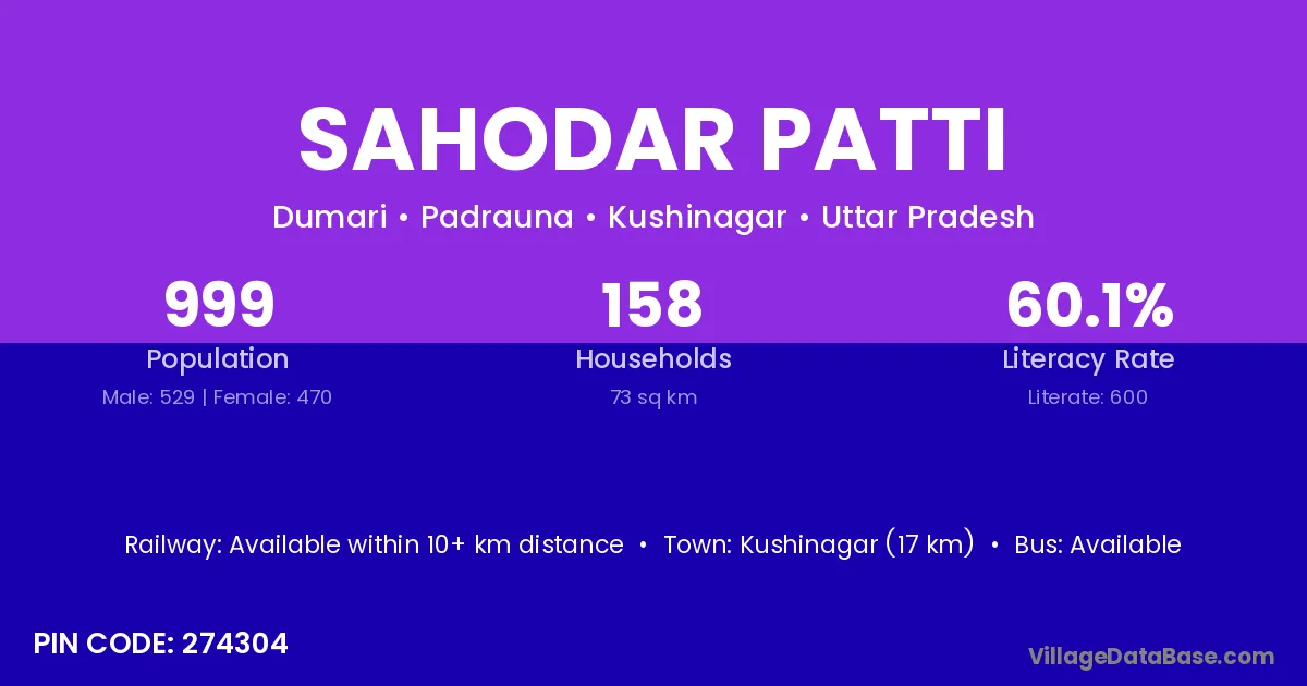 Kushinagar (17 km) is the nearest town to Sahodar Patti village for major economic activities and is located approximately 17 km away.