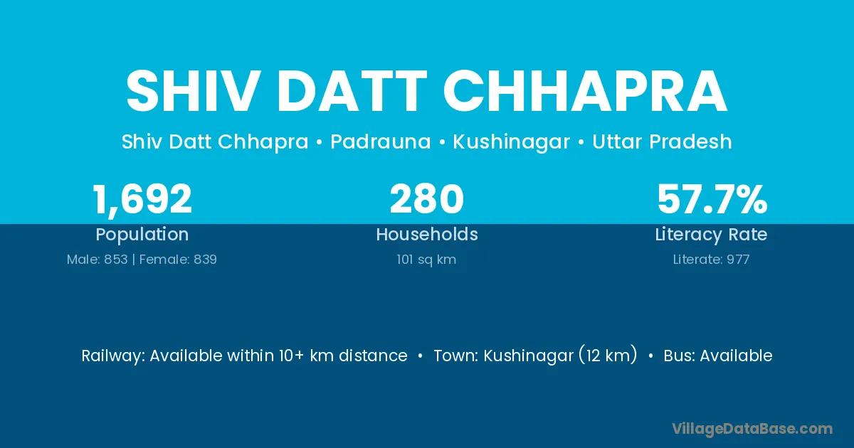 Kushinagar (12 km) is the nearest town to Shiv Datt Chhapra village for major economic activities and is located approximately 12 km away.