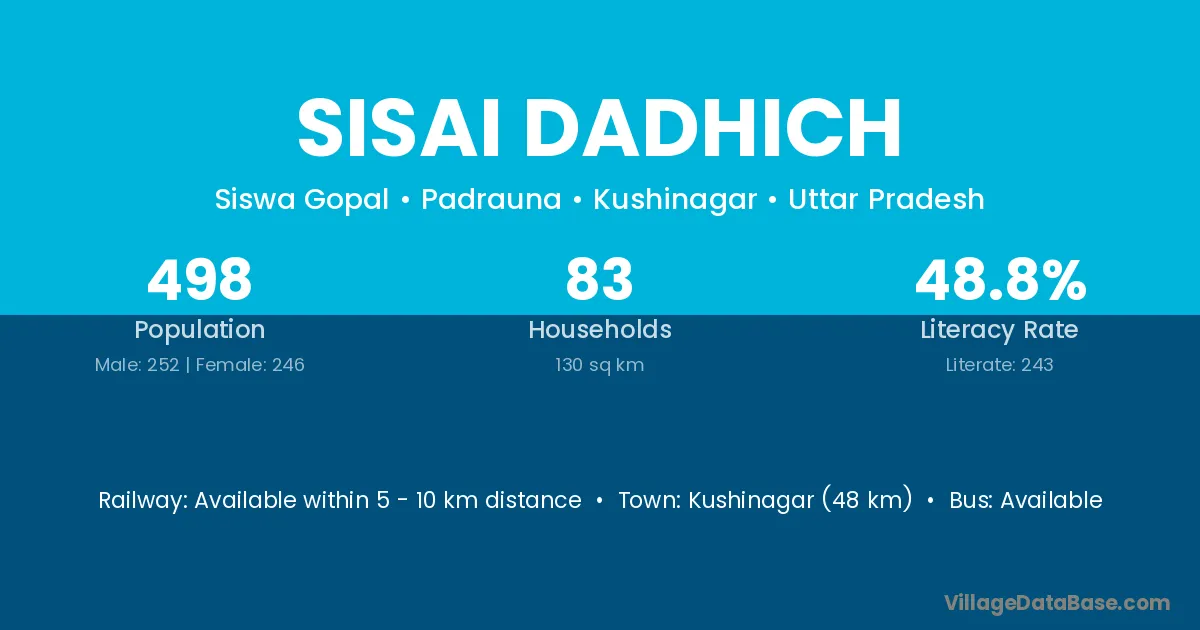 Kushinagar (48 km) is the nearest town to Sisai Dadhich village for major economic activities and is located approximately 48 km away.