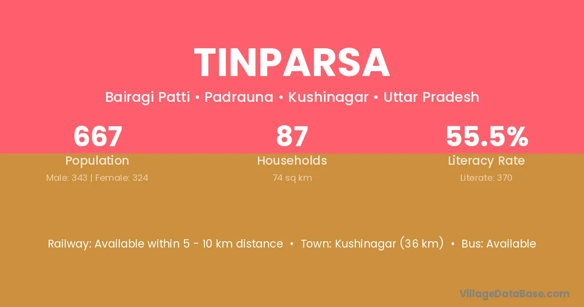 Kushinagar (36 km) is the nearest town to Tinparsa village for major economic activities and is located approximately 36 km away.