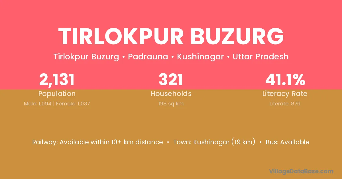 Kushinagar (19 km) is the nearest town to Tirlokpur Buzurg village for major economic activities and is located approximately 19 km away.