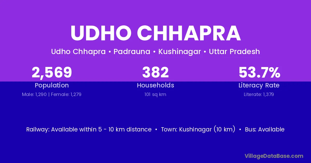 Kushinagar (10 km) is the nearest town to Udho Chhapra village for major economic activities and is located approximately 10 km away.