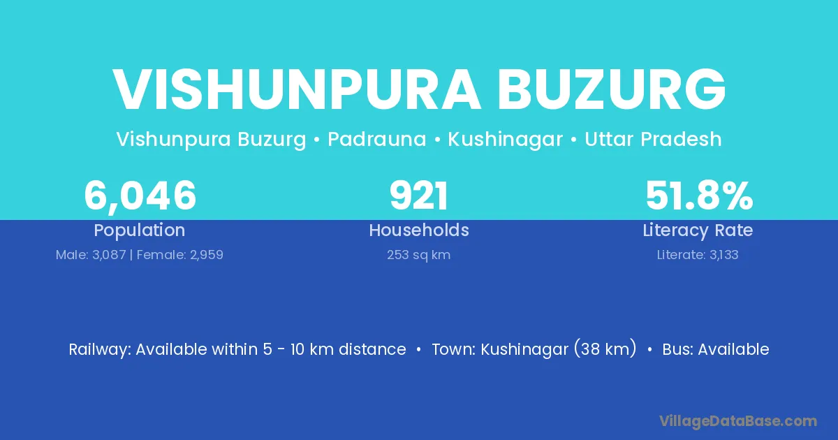 Kushinagar (38 km) is the nearest town to Vishunpura Buzurg village for major economic activities and is located approximately 38 km away.