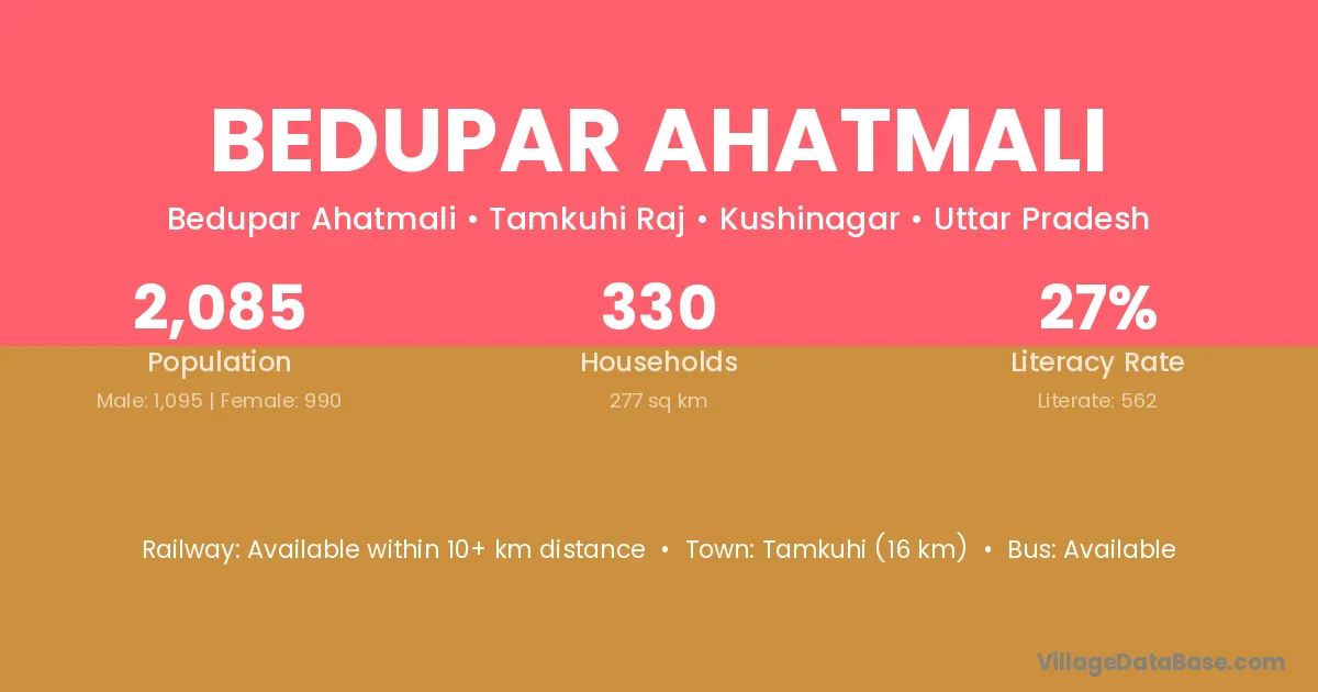 Tamkuhi (16 km) is the nearest town to Bedupar Ahatmali village for major economic activities and is located approximately 16 km away.