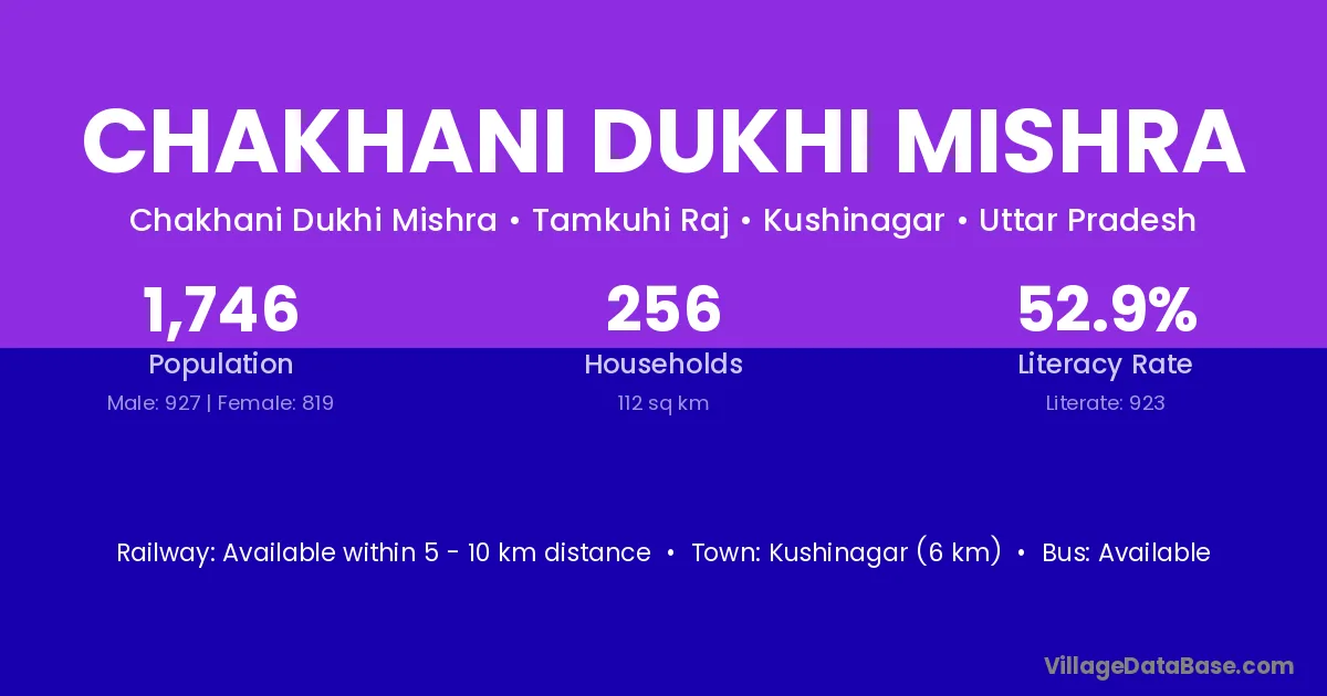 Kushinagar (6 km) is the nearest town to Chakhani Dukhi Mishra village for major economic activities and is located approximately 6 km away.