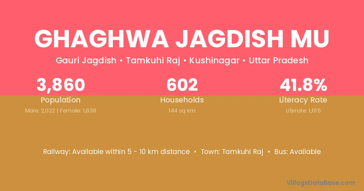 Ghaghwa Jagdish Mu village has a total population of 3,860 people, of which 2,022 are males and 1,838 are females.
