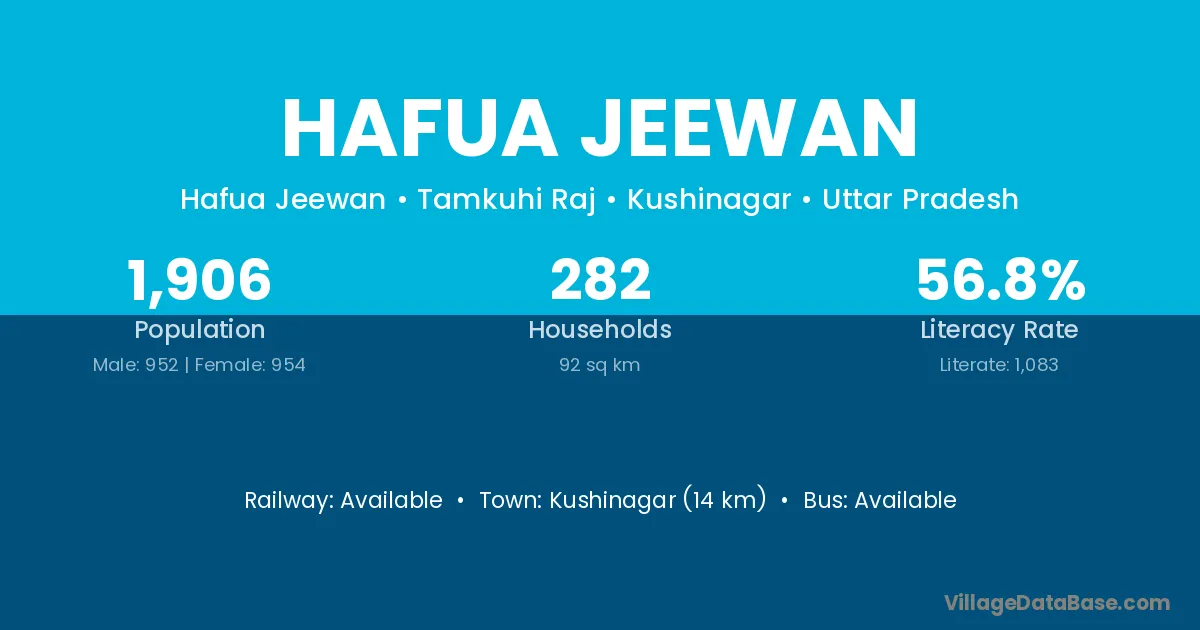 Kushinagar (14 km) is the nearest town to Hafua Jeewan village for major economic activities and is located approximately 14 km away.