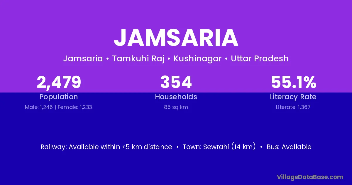 Jamsaria village has a total population of 2,479 people, of which 1,246 are males and 1,233 are females.
