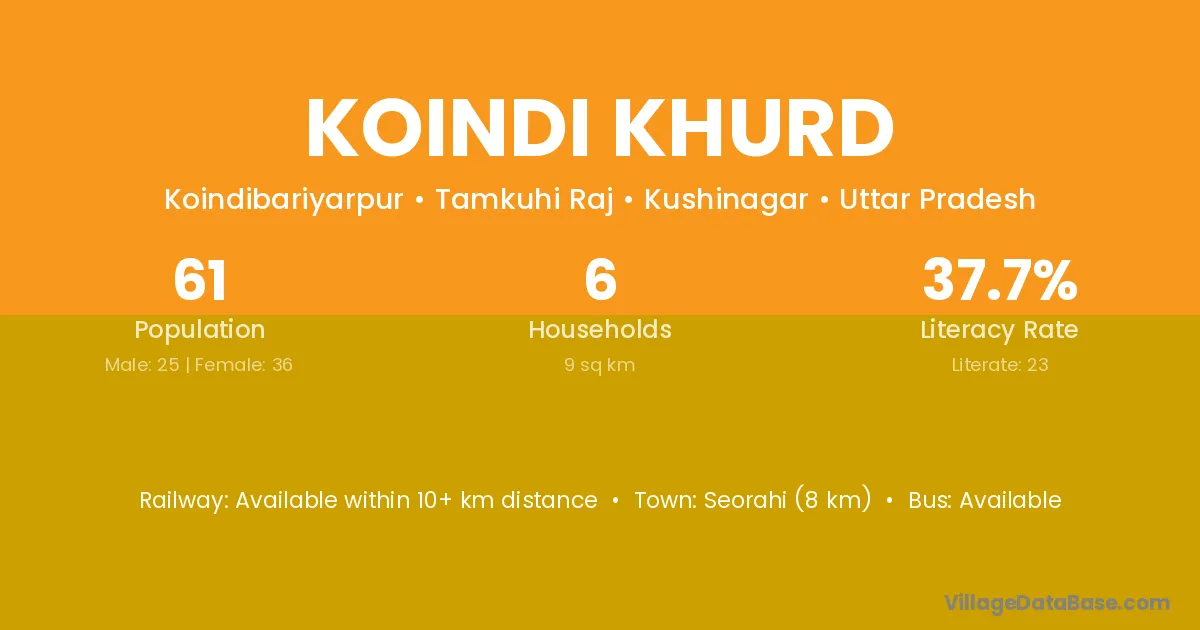 Seorahi (8 km) is the nearest town to Koindi Khurd village for major economic activities and is located approximately 8 km away.