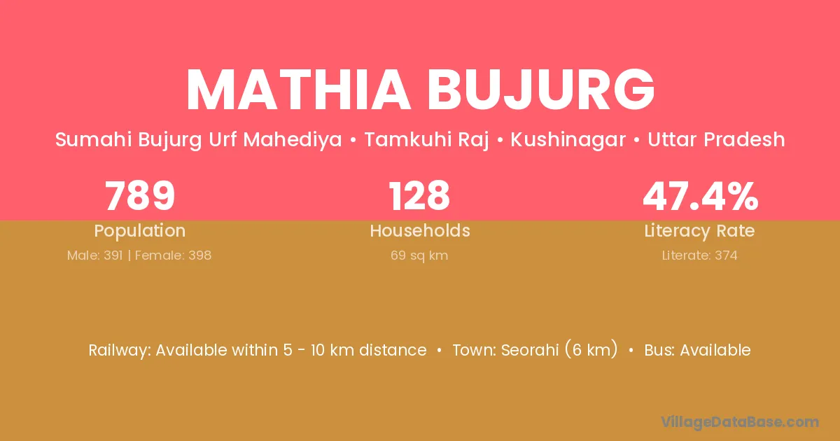 Seorahi (6 km) is the nearest town to Mathia Bujurg village for major economic activities and is located approximately 6 km away.