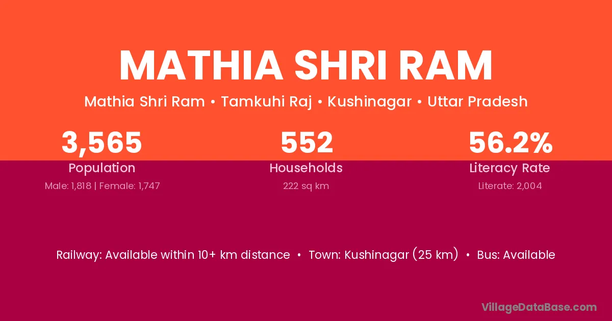 Kushinagar (25 km) is the nearest town to Mathia Shri Ram village for major economic activities and is located approximately 25 km away.
