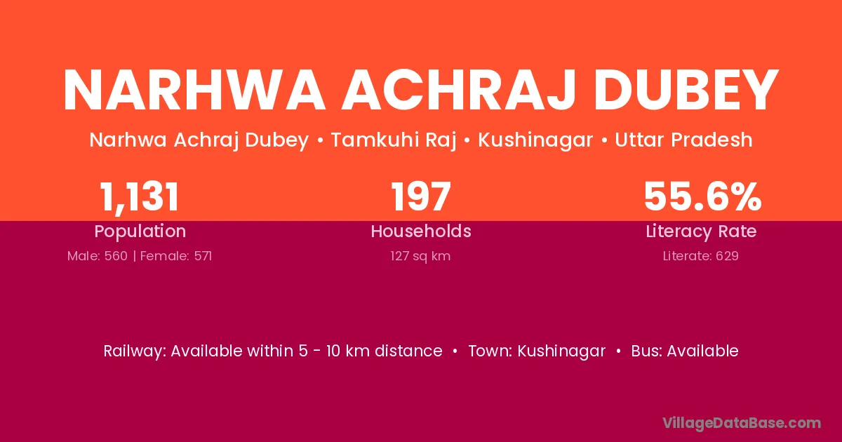 Narhwa Achraj Dubey village has a total population of 1,131 people, of which 560 are males and 571 are females.