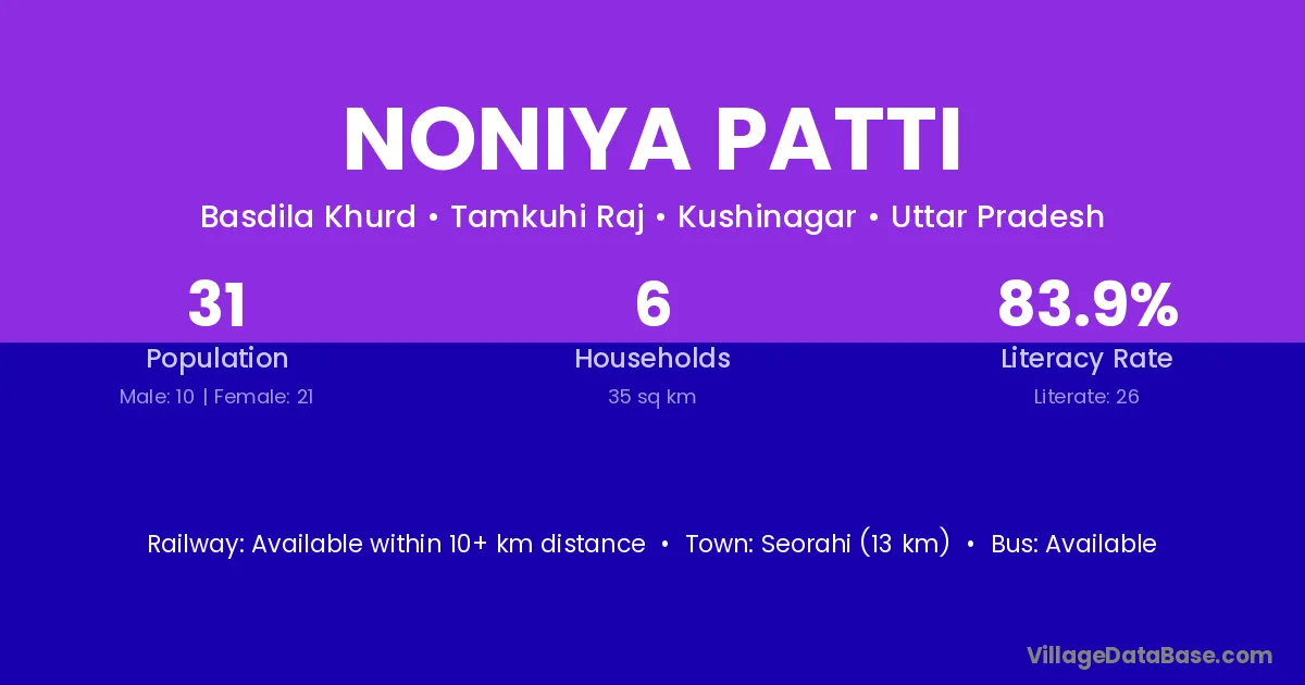 Noniya Patti village has a total population of 31 people, of which 10 are males and 21 are females.