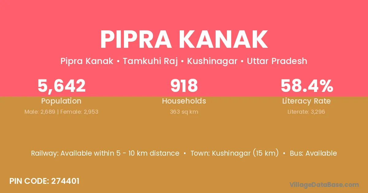 Kushinagar (15 km) is the nearest town to Pipra Kanak village for major economic activities and is located approximately 15 km away.