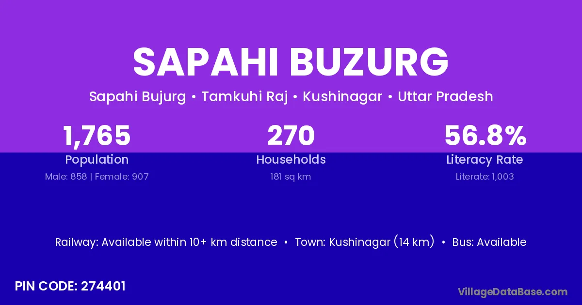 Kushinagar (14 km) is the nearest town to Sapahi Buzurg village for major economic activities and is located approximately 14 km away.