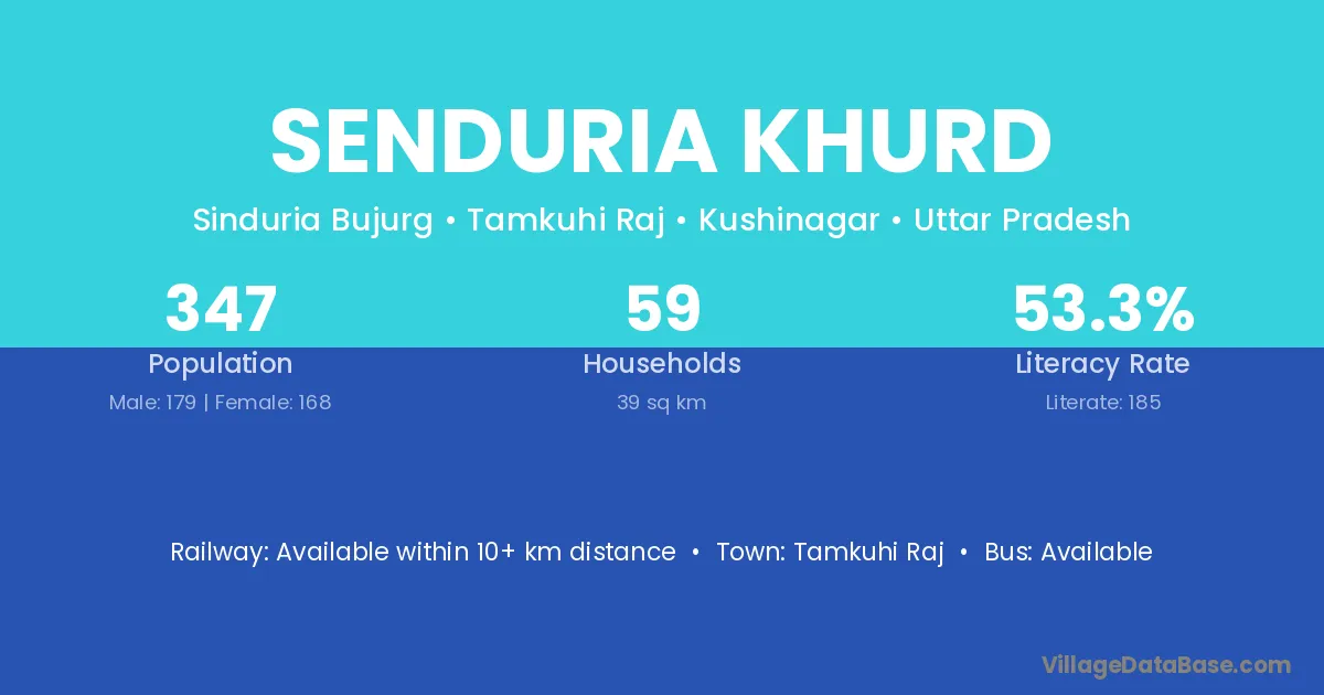 Senduria Khurd village has a total population of 347 people, of which 179 are males and 168 are females.