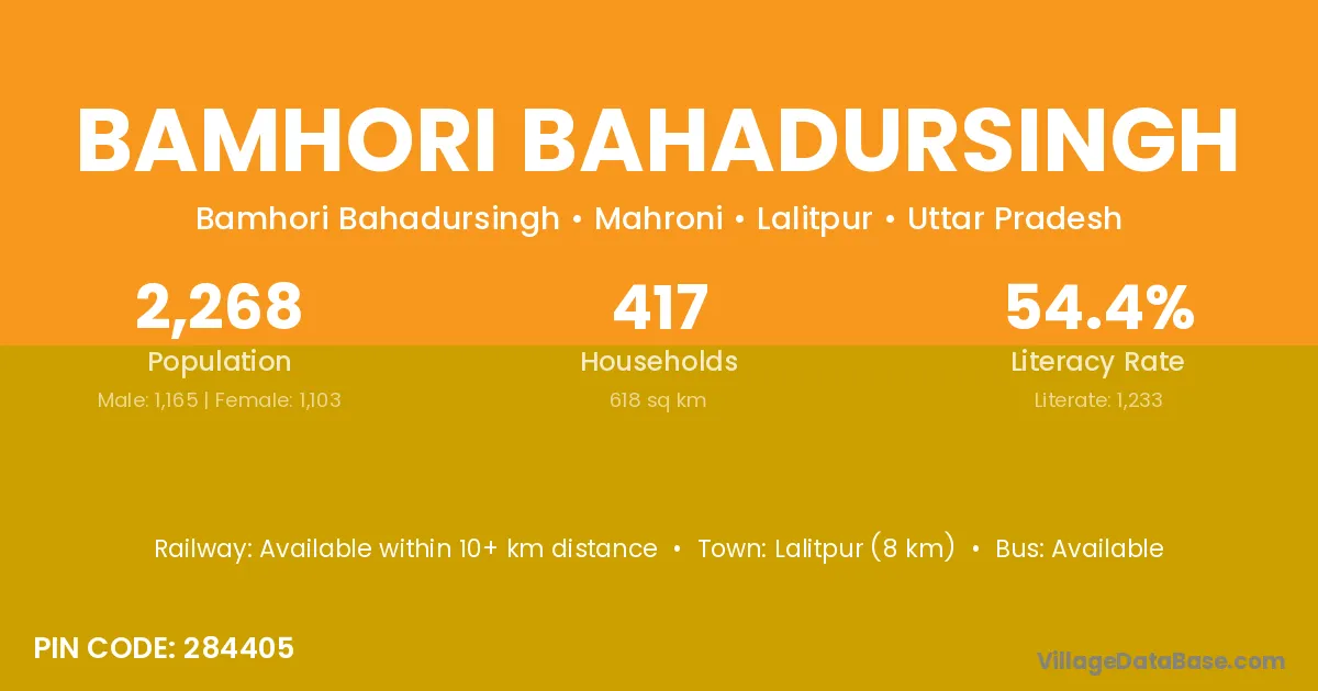 Lalitpur (8 km) is the nearest town to Bamhori Bahadursingh village for major economic activities and is located approximately 8 km away.
