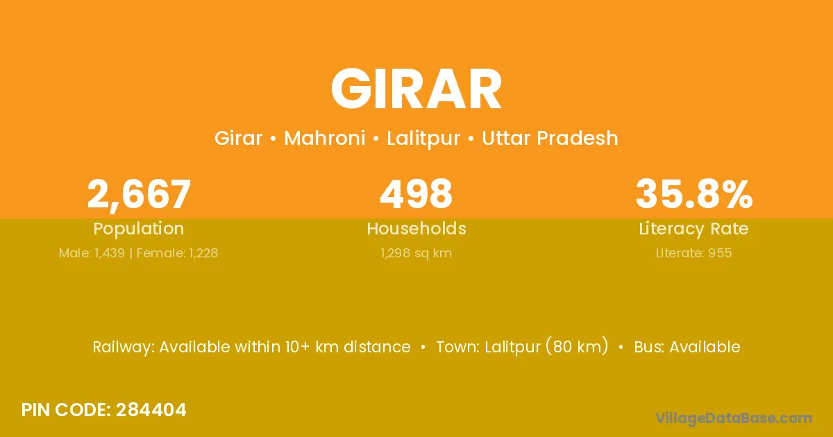 Lalitpur (80 km) is the nearest town to Girar village for major economic activities and is located approximately 80 km away.