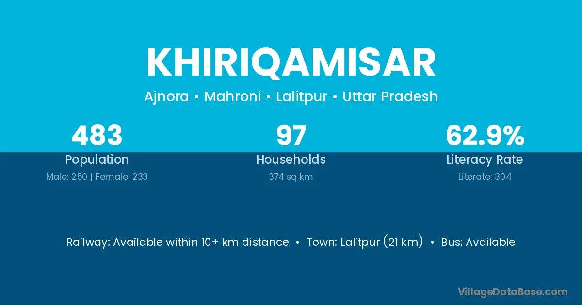 Lalitpur (21 km) is the nearest town to Khiriqamisar village for major economic activities and is located approximately 21 km away.