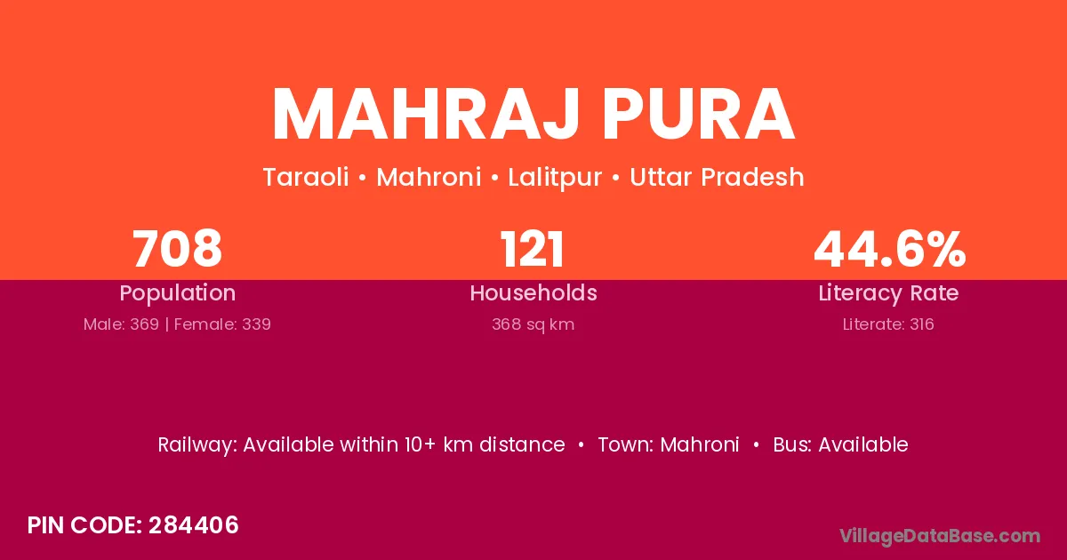 Mahraj Pura village has a total population of 708 people, of which 369 are males and 339 are females.