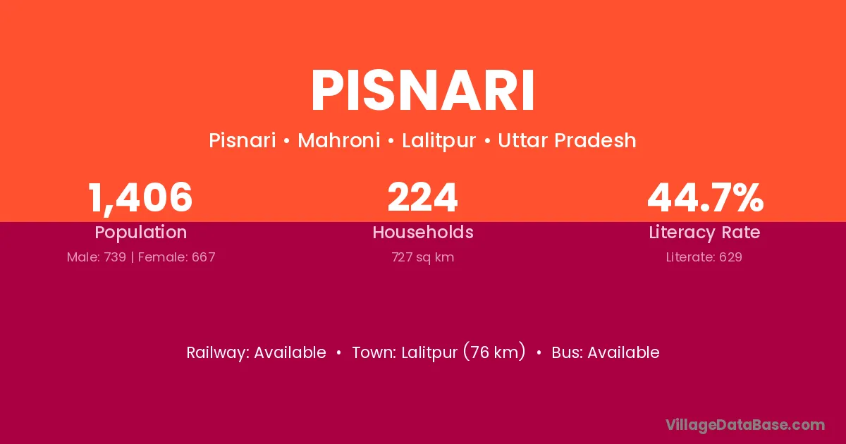 Lalitpur (76 km) is the nearest town to Pisnari village for major economic activities and is located approximately 76 km away.