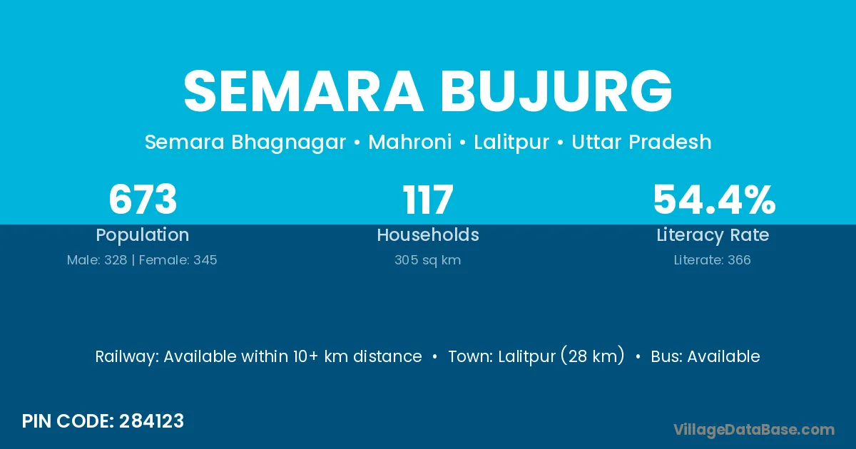 Lalitpur (28 km) is the nearest town to Semara Bujurg village for major economic activities and is located approximately 28 km away.
