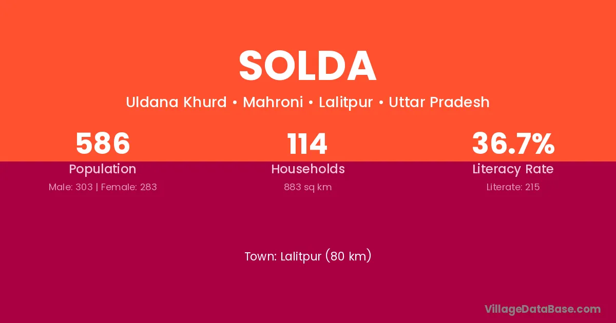 Lalitpur (80 km) is the nearest town to Solda village for major economic activities and is located approximately 80 km away.