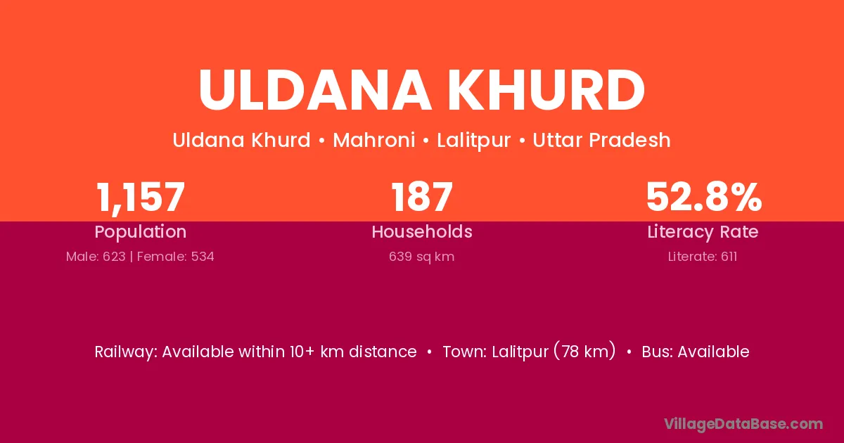 Lalitpur (78 km) is the nearest town to Uldana Khurd village for major economic activities and is located approximately 78 km away.
