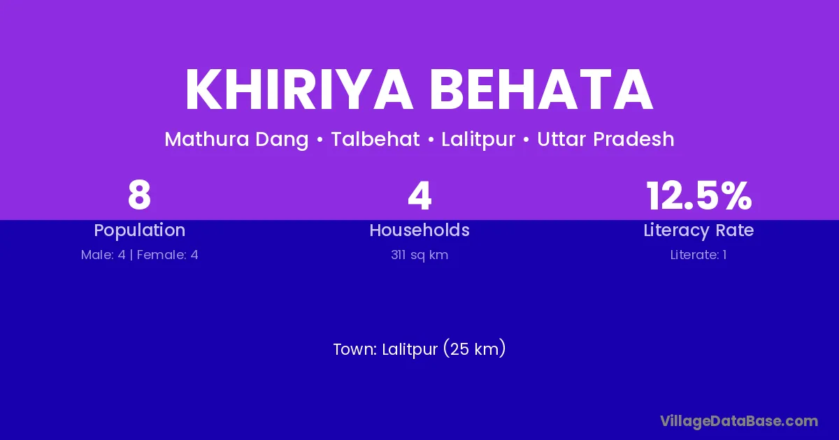 Lalitpur (25 km) is the nearest town to Khiriya Behata village for major economic activities and is located approximately 25 km away.