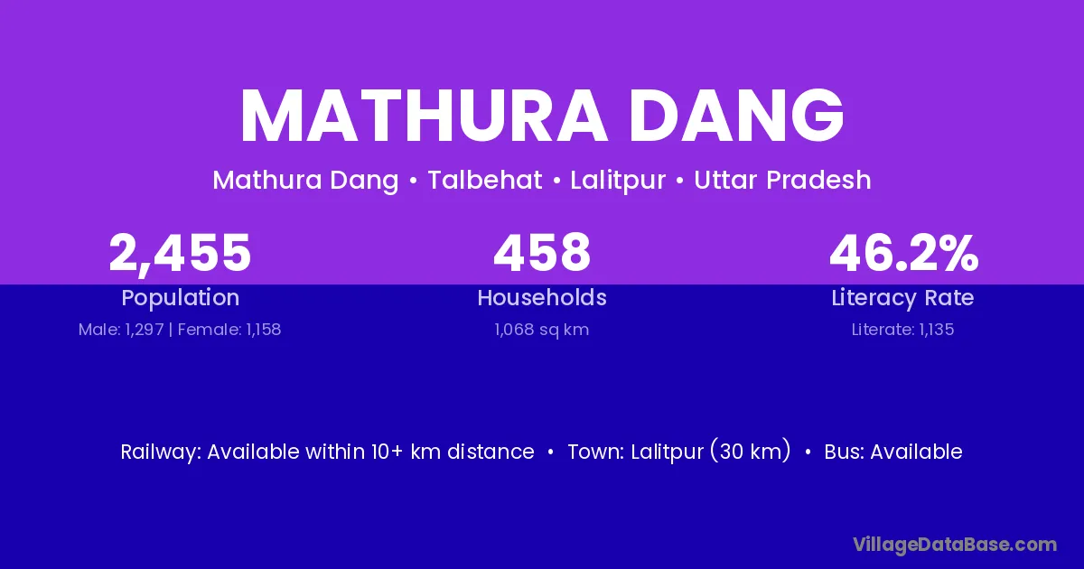 Lalitpur (30 km) is the nearest town to Mathura Dang village for major economic activities and is located approximately 30 km away.