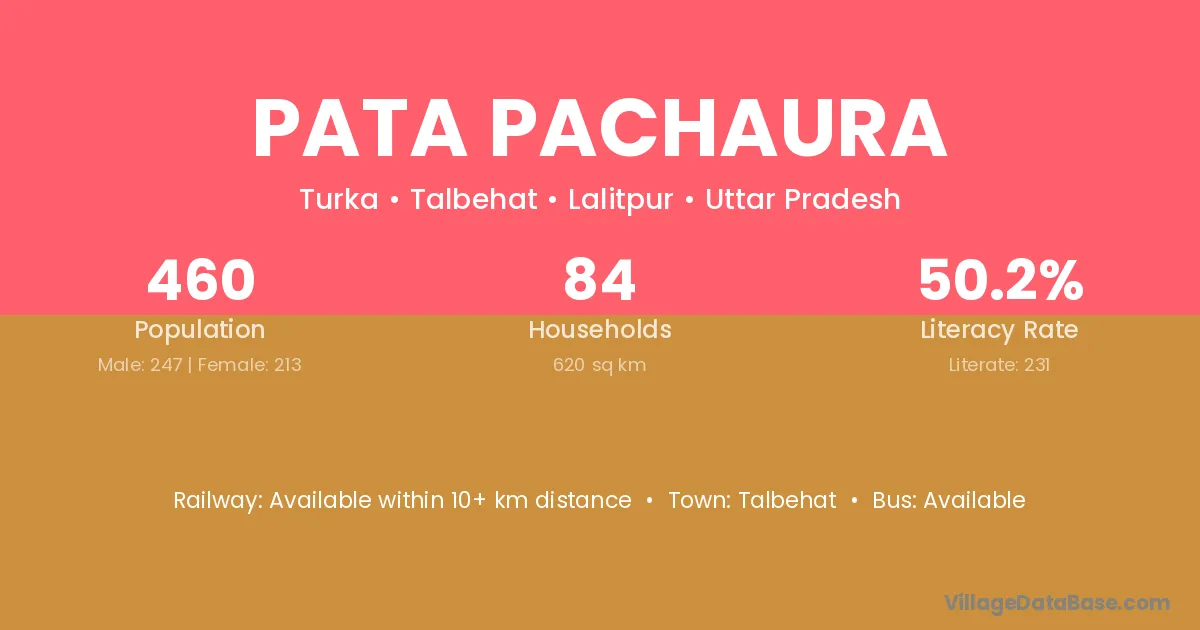 Pata Pachaura village has a total population of 460 people, of which 247 are males and 213 are females.