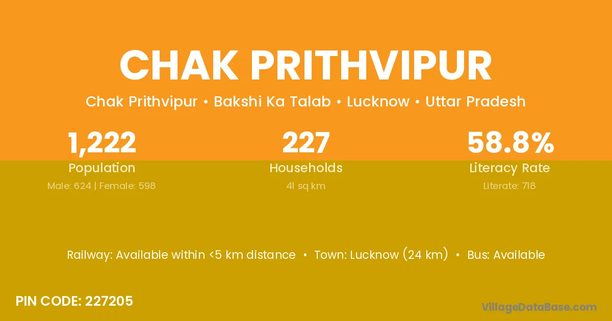 Lucknow (24 km) is the nearest town to Chak Prithvipur village for major economic activities and is located approximately 24 km away.