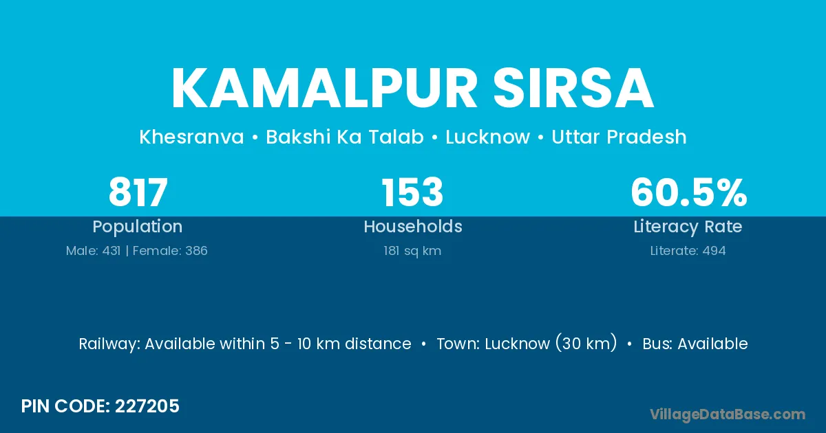 Lucknow (30 km) is the nearest town to Kamalpur Sirsa village for major economic activities and is located approximately 30 km away.