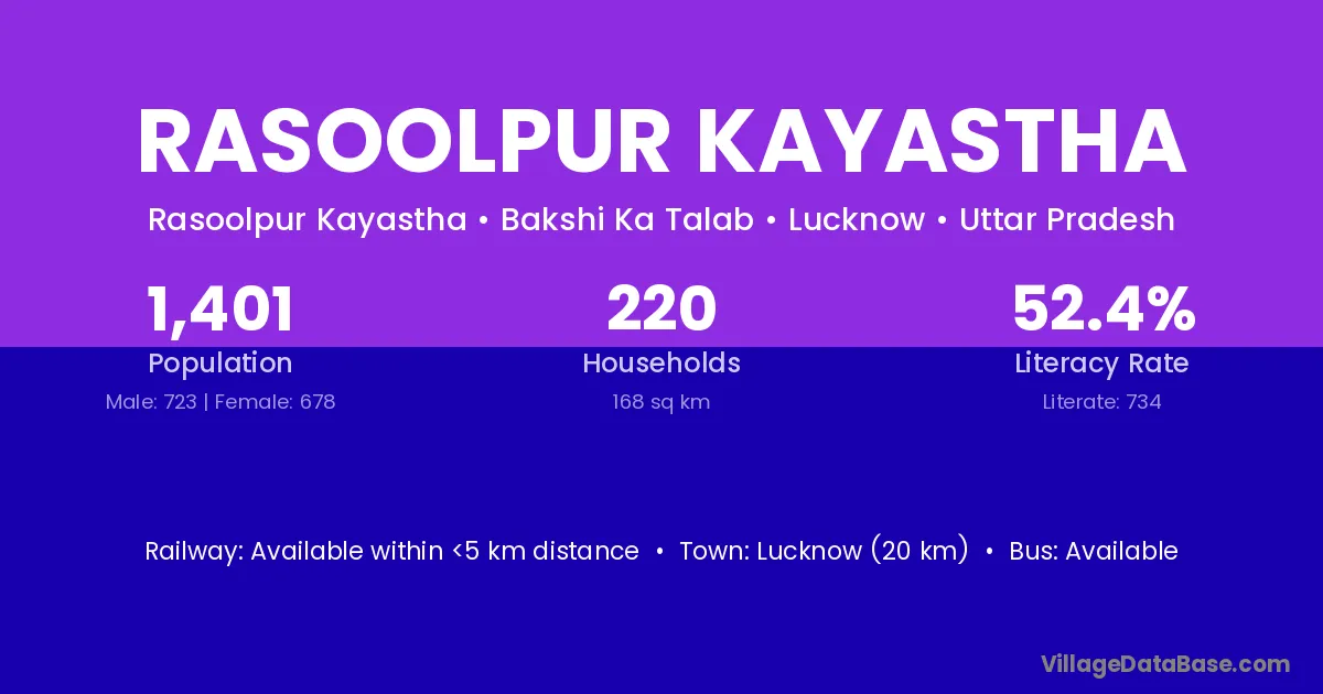 Lucknow (20 km) is the nearest town to Rasoolpur Kayastha village for major economic activities and is located approximately 20 km away.