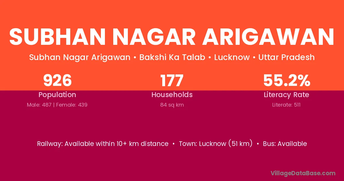 Subhan Nagar Arigawan village has a total population of 926 people, of which 487 are males and 439 are females.