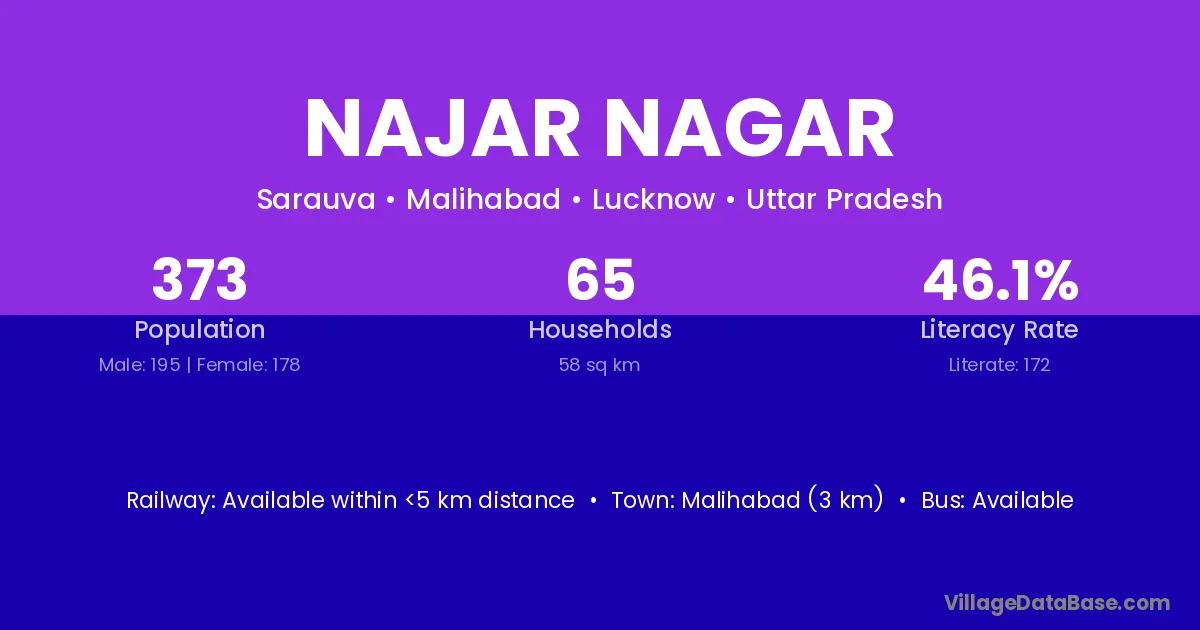 Malihabad (3 km) is the nearest town to Najar Nagar village for major economic activities and is located approximately 3 km away.