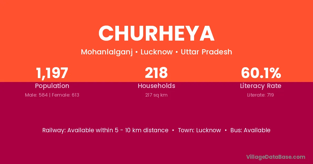 Churheya village has a total population of 1,197 people, of which 584 are males and 613 are females.