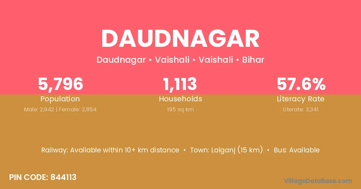 The literacy rate of Daudnagar village is 57.30%. Male literacy stands at 64.60% and female literacy at 49.57%.