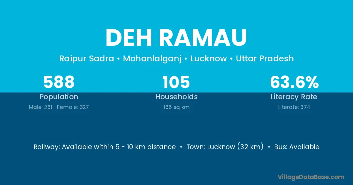 Lucknow (32 km) is the nearest town to Deh Ramau village for major economic activities and is located approximately 32 km away.