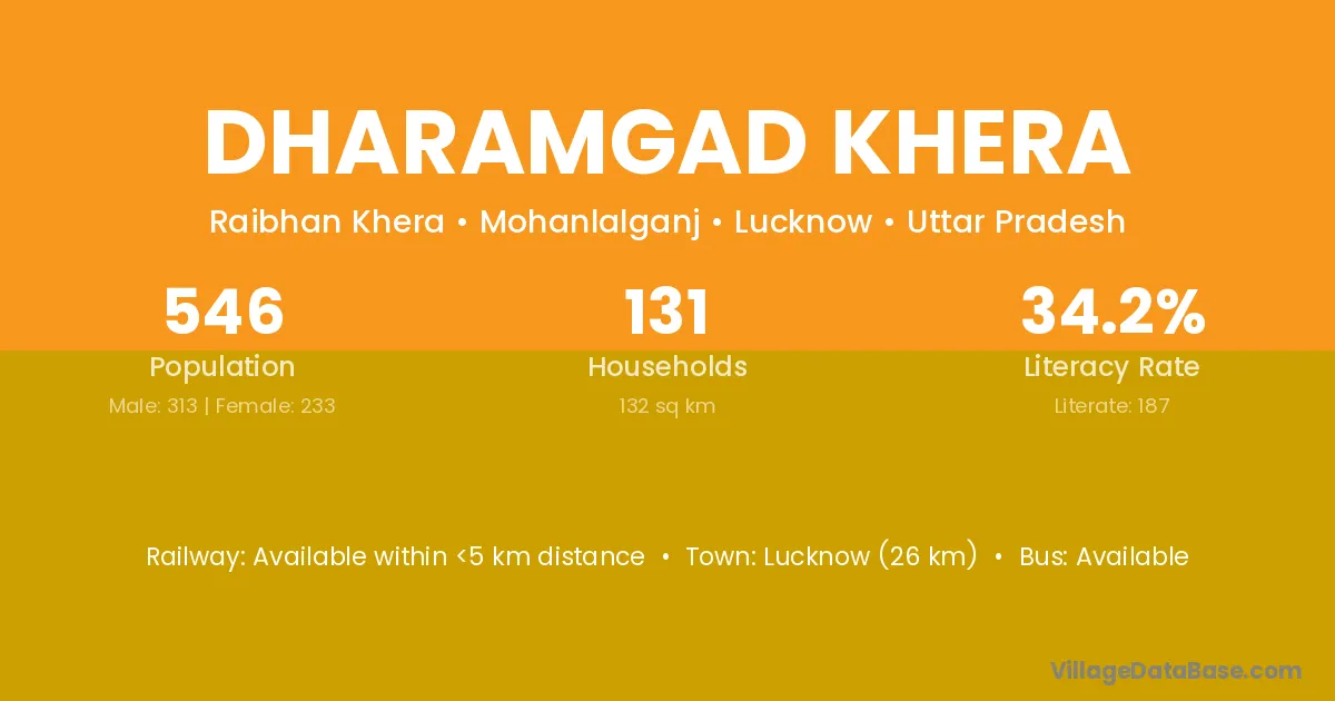 Lucknow (26 km) is the nearest town to Dharamgad Khera village for major economic activities and is located approximately 26 km away.