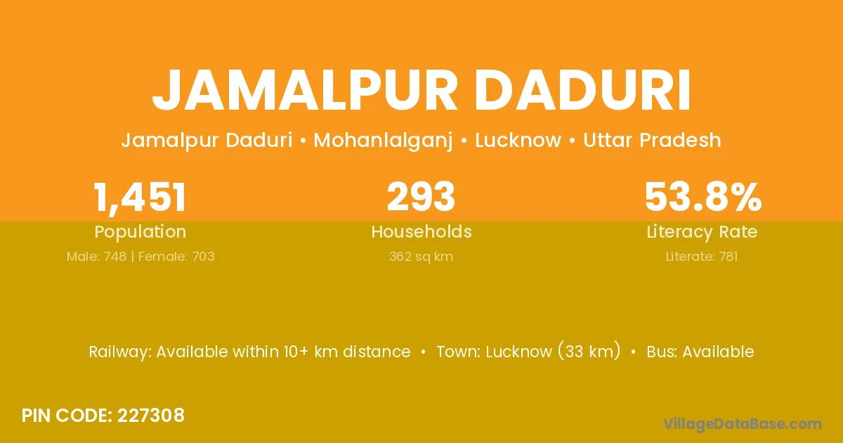 Lucknow (33 km) is the nearest town to Jamalpur Daduri village for major economic activities and is located approximately 33 km away.