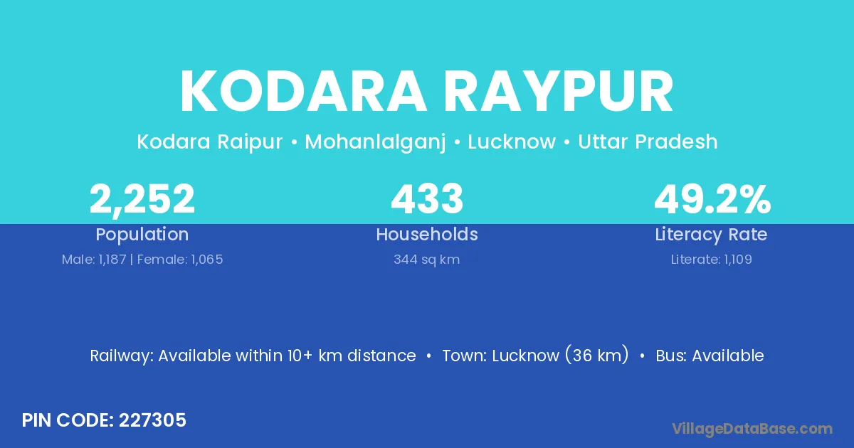 Lucknow (36 km) is the nearest town to Kodara Raypur village for major economic activities and is located approximately 36 km away.