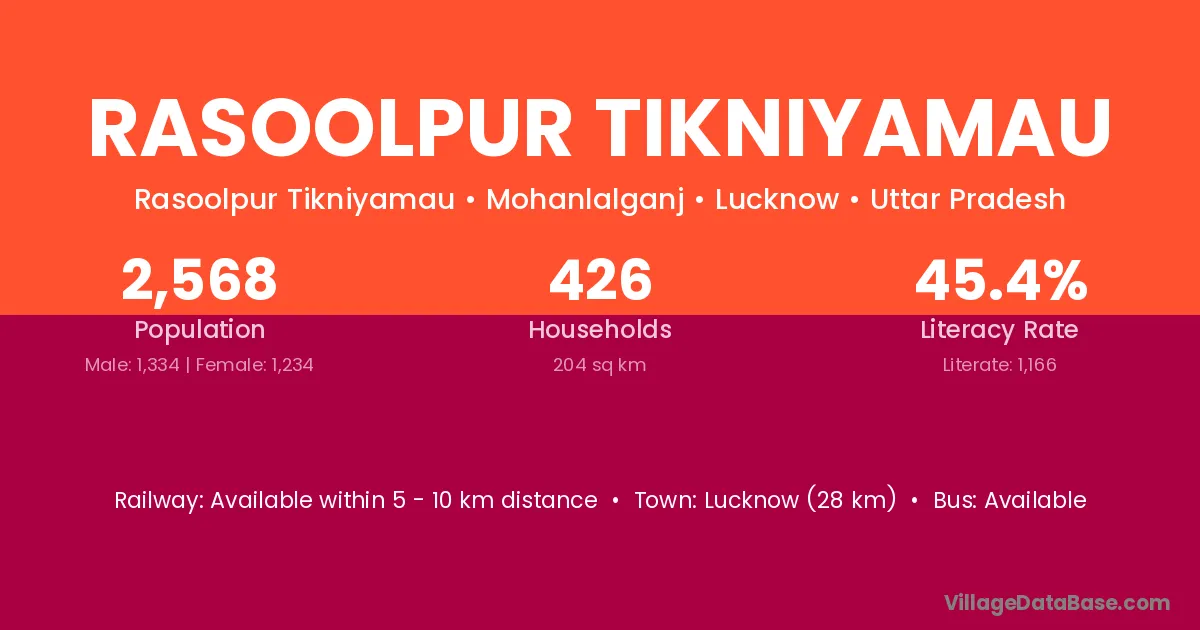 Lucknow (28 km) is the nearest town to Rasoolpur Tikniyamau village for major economic activities and is located approximately 28 km away.