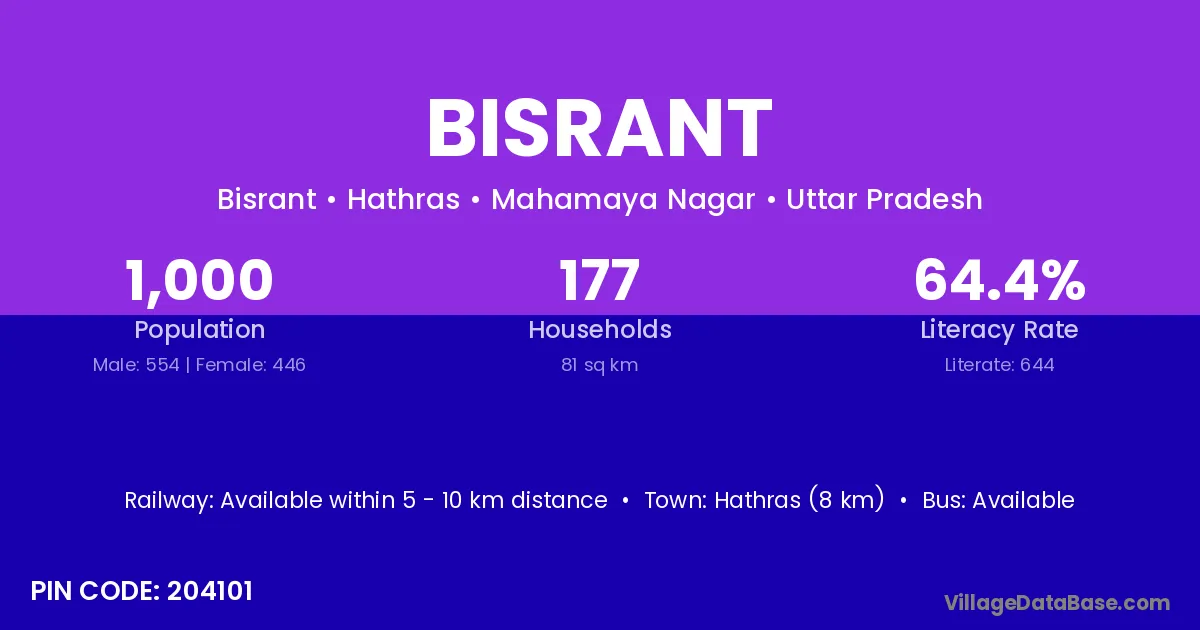 Hathras (8 km) is the nearest town to Bisrant village for major economic activities and is located approximately 8 km away.