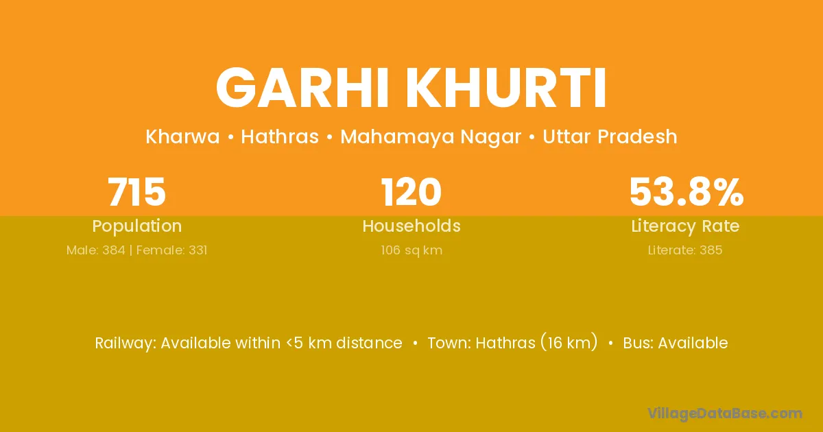 Hathras (16 km) is the nearest town to Garhi Khurti village for major economic activities and is located approximately 16 km away.
