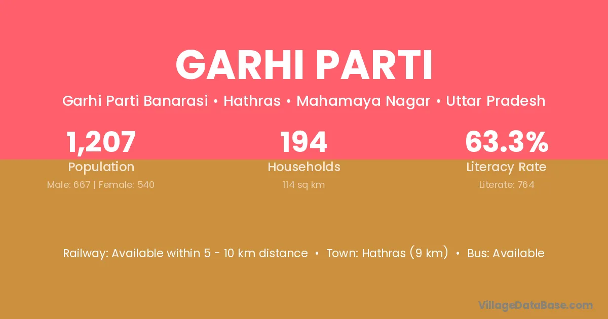 Hathras (9 km) is the nearest town to Garhi Parti village for major economic activities and is located approximately 9 km away.
